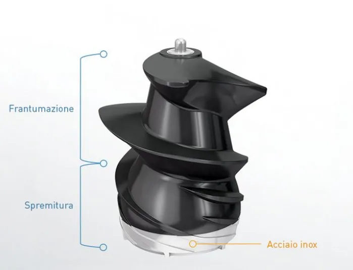 La parte superiore della vite in acciaio inox ha una forma allungata per una frantumazione più efficace. Dopo essere stati frantumati, gli ingredienti vengono spinti verso il basso e spremuti. E ancora, la parte inferiore della vite è stata progettata per lavorare anche la frutta e la verdura più resistente e durare a lungo.